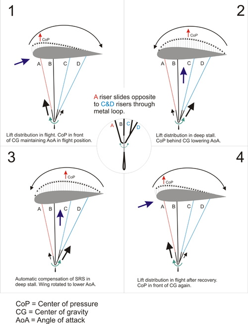 The principle of SRS® function is based on shifting the center of pressure when wing is stalled, creating an automatic leverage mechanism for reduction of wings angle of attack and immediate recovery from stall (sketches 3 and 4).